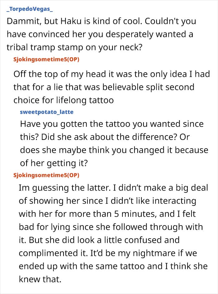 “As for comments I found useful or helpful, it was really just nice to know that it resonated with others. Validation does feel good, especially for something I haven’t really spoken about for a couple of years. What I did wasn’t great and there’s someone out there walking around with a tattoo they got for (in my opinion) a bad reason. But I lied, so how good can that really feel? It’s on them forever unless they drop more cash on laser removal. Lastly, to the readers addressing the fact that we were adults(22/23yo) playing children’s games. We are fully aware. It was ridiculous- but it was a fun time. Ever see the New Girl cast play “True American?” I highly recommend for a similar vibe. Thank you for reading, and if you ever see someone with a Haku tattoo, compliment them. 99.99% of the time they’re probably awesome.”