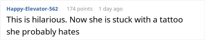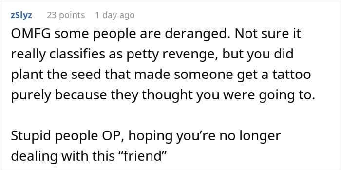 A woman shared her bit of petty revenge on a woman who would constantly try to one-up her by telling her about a tattoo she was “planning” to get. As it turns out, this was the perfect bait. We got in touch with the woman who made the post to learn more.