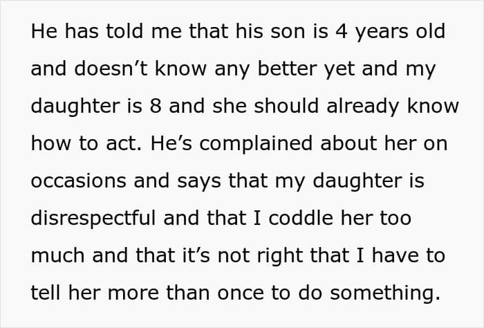In this situation, instead of taking a step back, the OP’s boyfriend kept trying to control what her daughter did and criticized her for even the smallest things. He complained that the woman kept coddling the little girl and even refused to show her any affection, stating that it was “weird.” This meant that even if the child wanted to hold his hand, he would get mad or stop her.