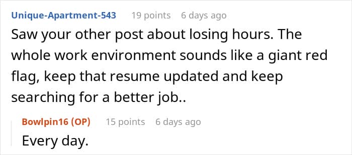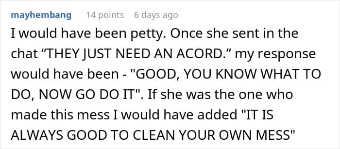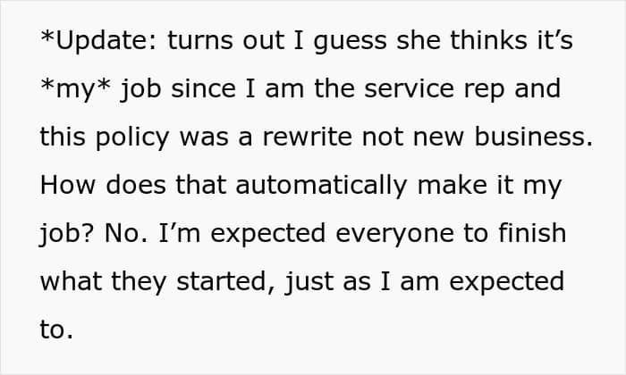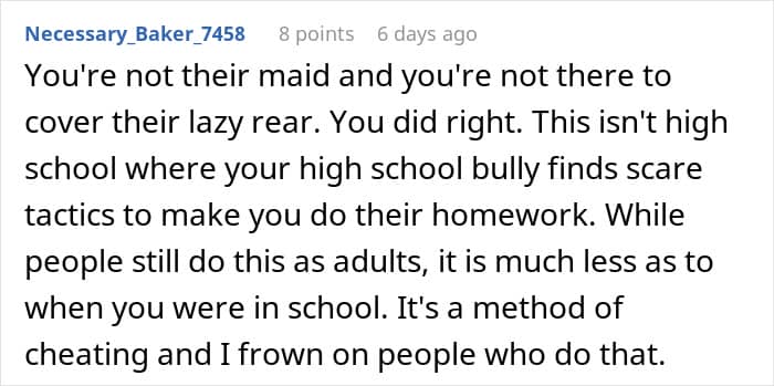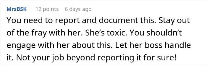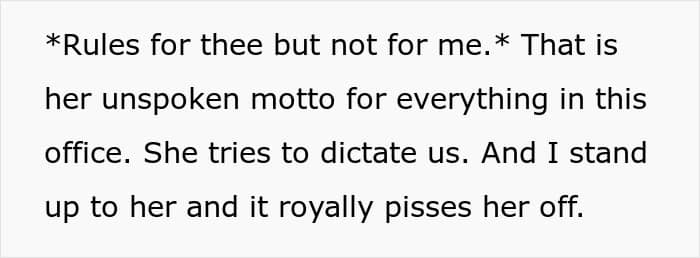 Furthermore, after completing her immediate work duties, this lady began badmouthing the author to another coworker, who was usually her gossip buddy. Apparently, the woman believed the author should’ve done it, and when she had to do the work herself, she lost it. “Rules for thee, but not for me. That’s her unspoken motto for everything in this office,” the OP sums up.
