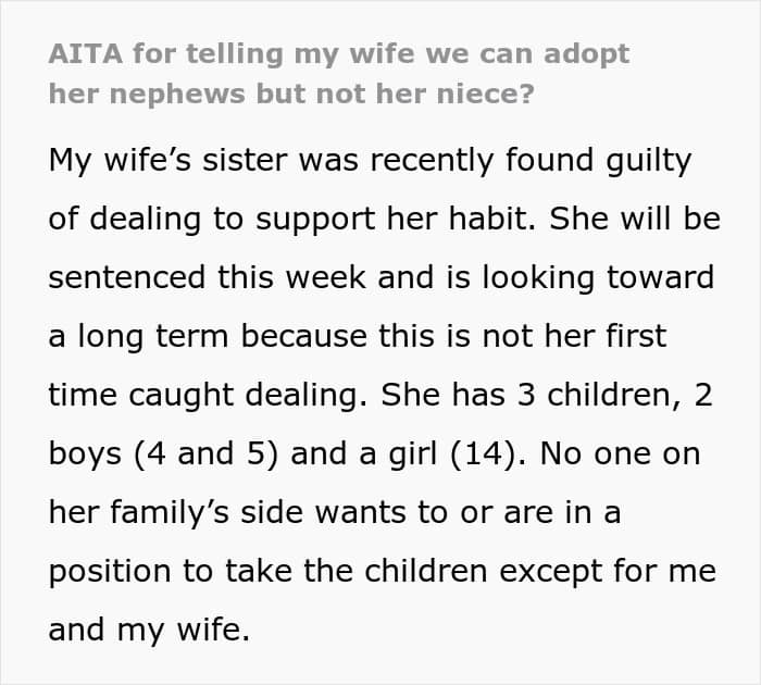 “AITA For Telling My Wife We Can Adopt Her Nephews But Not Her Niece?”