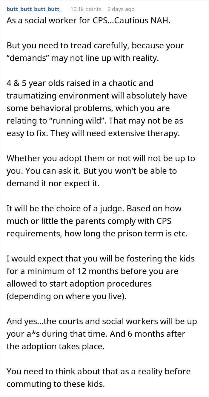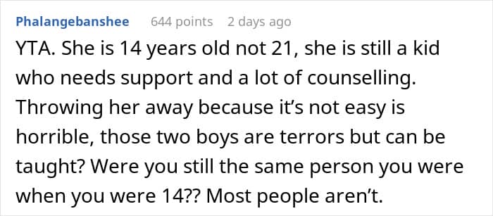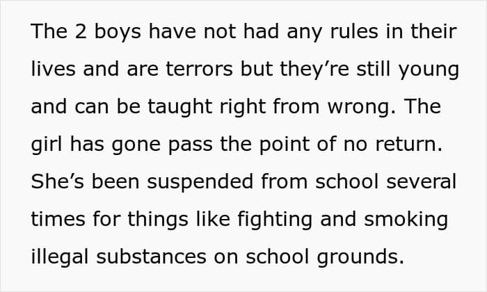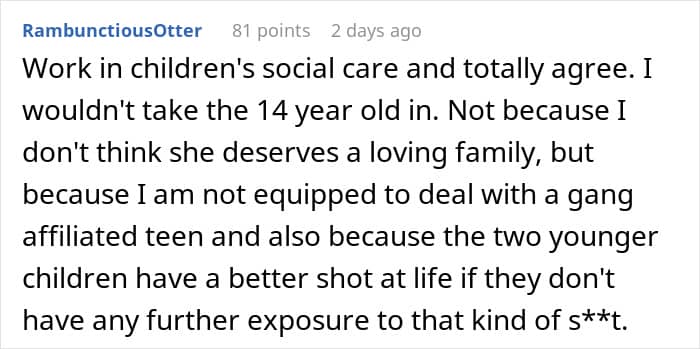 The circumstances in this situation make it even worse. The potential parents have no prior experience, the teen has already picked up bad habits, and, on top of it all, there would be two minors there to care for as well. That is a lot of responsibility to take on, especially when it’s thrust upon you and you seem to have no choice.