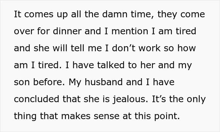 It wasn’t more than 30 minutes into their first encounter when Beth learned what her husband’s mom does and started making scornful comments about it. From asking how the OP can be tired if she doesn’t work to saying that it’s no wonder she had time to make a pie while staying at home all day, the remarks never stopped.