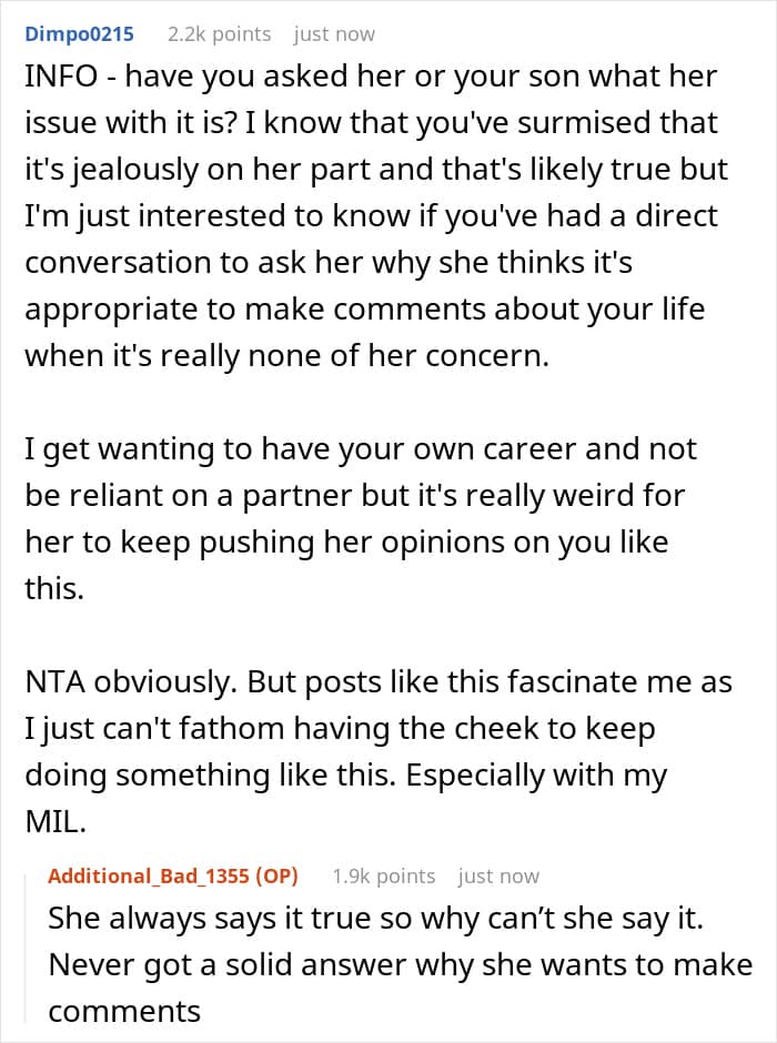When it came to the AITA verdict, the community deemed the woman Not The A-hole (NTA). But while most said that although her DIL is entitled to her opinion, it was rude to make those comments, some were questioning whether she’s really wrong.