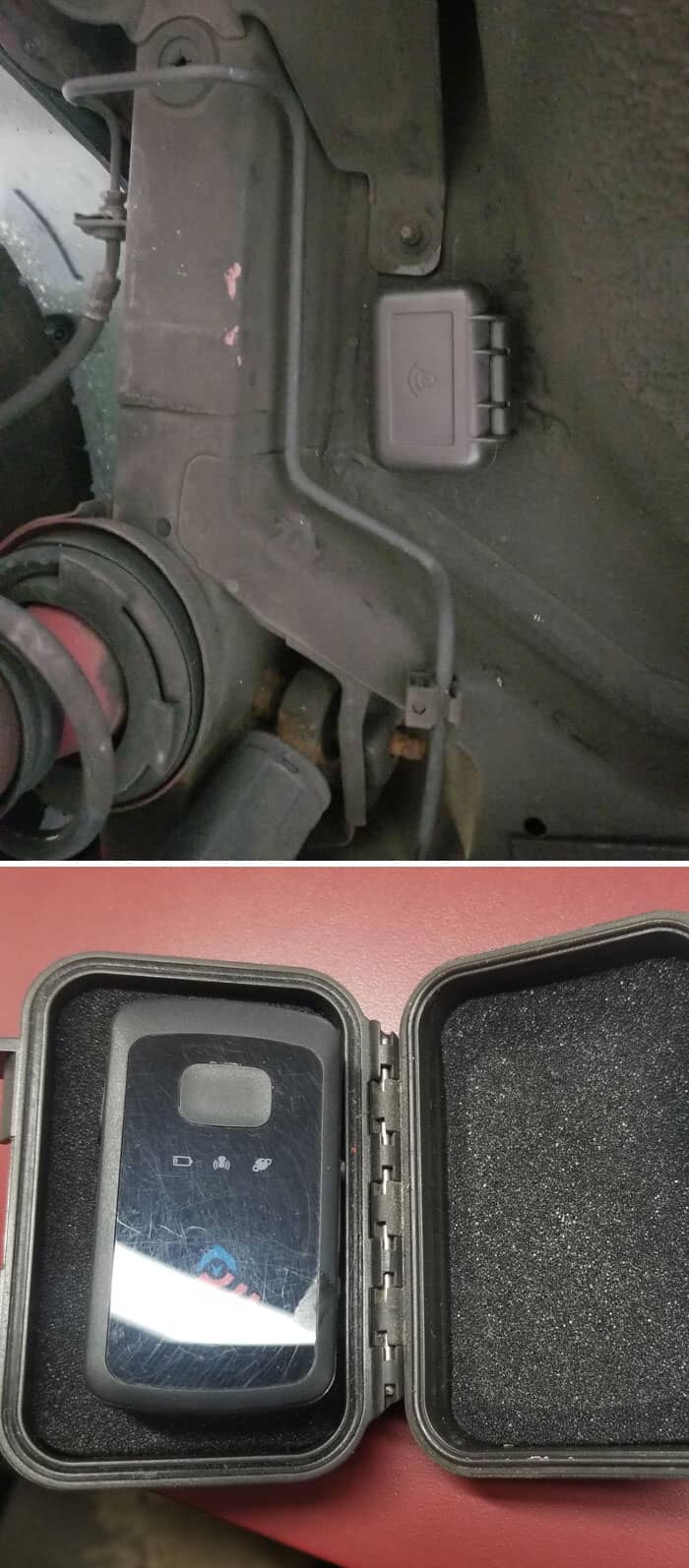 A decently hidden GPS tracker on a 2015 Hyundai Elantra. This model was available on Amazon for about 60 bucks. We let the customer know.