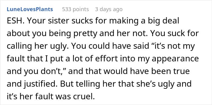 Others were of a slightly different opinion – they stated that both sisters were wrong here. There were some who even added that both of them sound like middle-schoolers. So, let’s say if the OP came to Reddit for reassurance that she wasn’t wrong, it’s quite likely that she did get it.