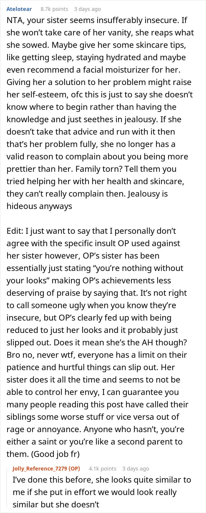 This made the OP lose it. She told Tessa to stop insinuating this thing over and over again, and added that it’s not her fault that Tessa is ugly. This event caused drama in their family because apparently everyone was split on who to support.