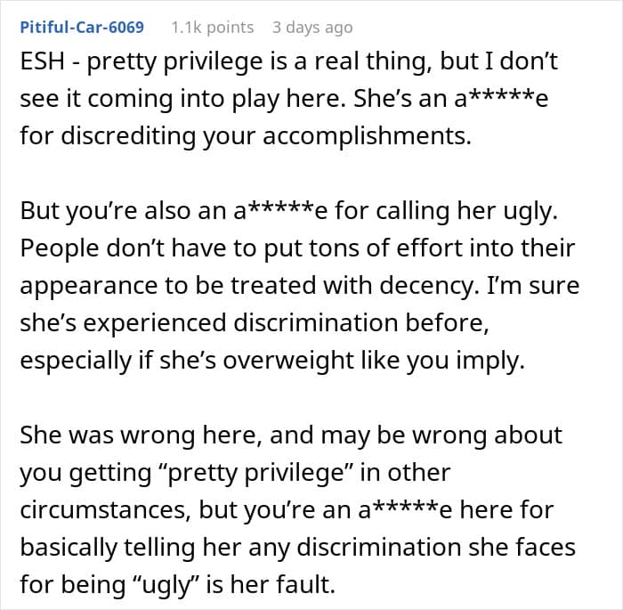While we cannot be sure if it was actually pretty privilege that helped the OP to achieve what she wanted or just her hard work, we can be sure what the commentators thought. And they were divided. Some certainly said that Tessa seemed like an insufferable person and so the OP was not the jerk.