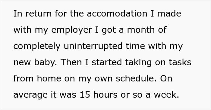 The OP recently gave birth to a child, and when she was still pregnant, the employer provided her with a full year of maternity leave on fairly comfortable conditions, without loss of seniority and other salary bonuses. And then, some time after the baby was born, the new mom started taking on some work assignments and started getting involved in the work process. On average, according to the OP herself, it took her about 15 hours a week.