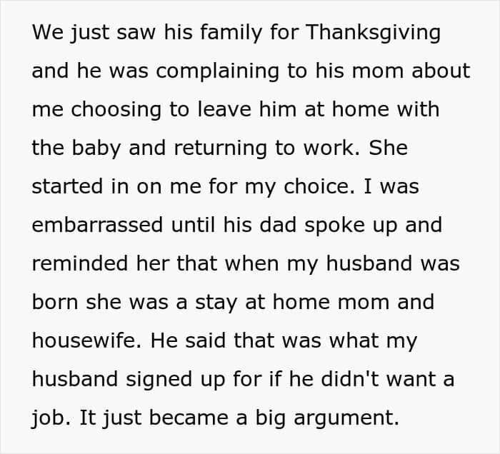 The only one left unhappy with this decision was the husband. He stated that the wife is being cruel as the baby needs her. The man then said that babysitting makes him feel ’emasculated’ and ended up complaining about the wife’s behavior to his parents during the family Thanksgiving dinner. We must say that the OP’s mother-in-law supported her son, while the FIL stated that was what the husband signed up for if he didn’t want a job. Be that as it may, the family quarrel has continued, and is far from being resolved.