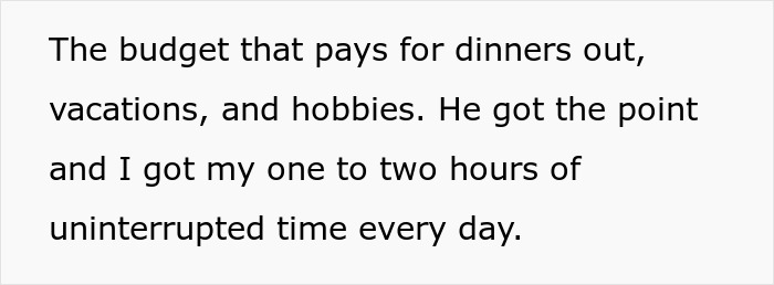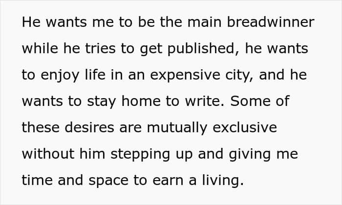 At the same time, the wife remained the main breadwinner for the whole family, because the husband was actually unemployed, counting on the fame and big money that awaited him. He refused to find any job, claiming that it would interfere with his creative work, and he also did not want to hire a nanny, because the OP stated that those services would then be funded from their fun budget.