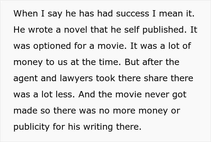 So the author of the original post works for a tech company while her husband is an aspiring author. Some time ago, he published a novel at his own expense, which had some success and producers even acquired the film rights. The film, however, was never made, but the couple received a fairly large amount of money, which inspired the Original Poster’s husband to further work.