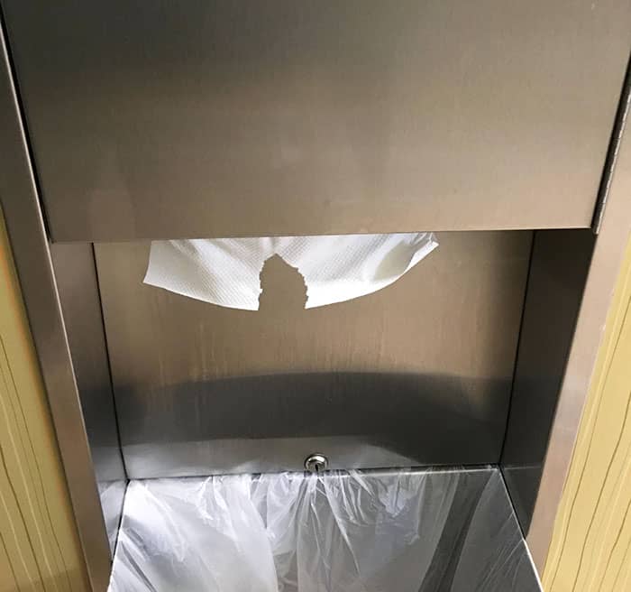 #46 This Toiletry Trash Can That Opens Into The Other Stall