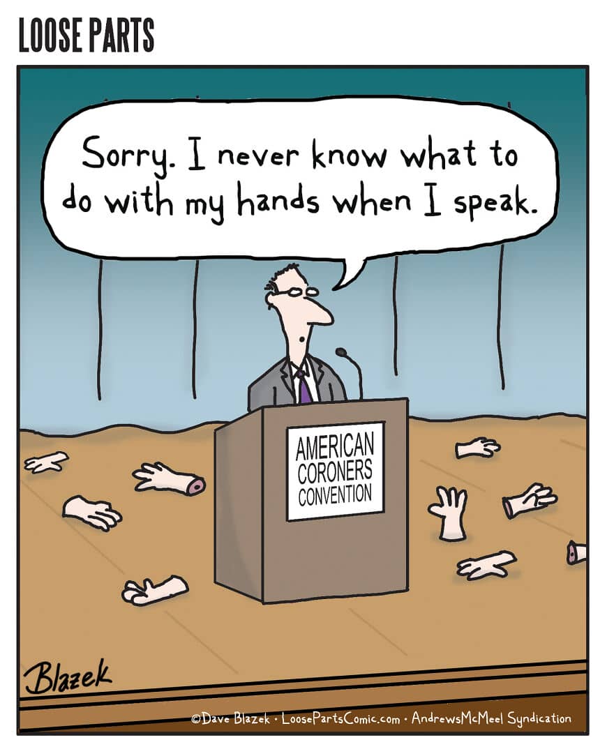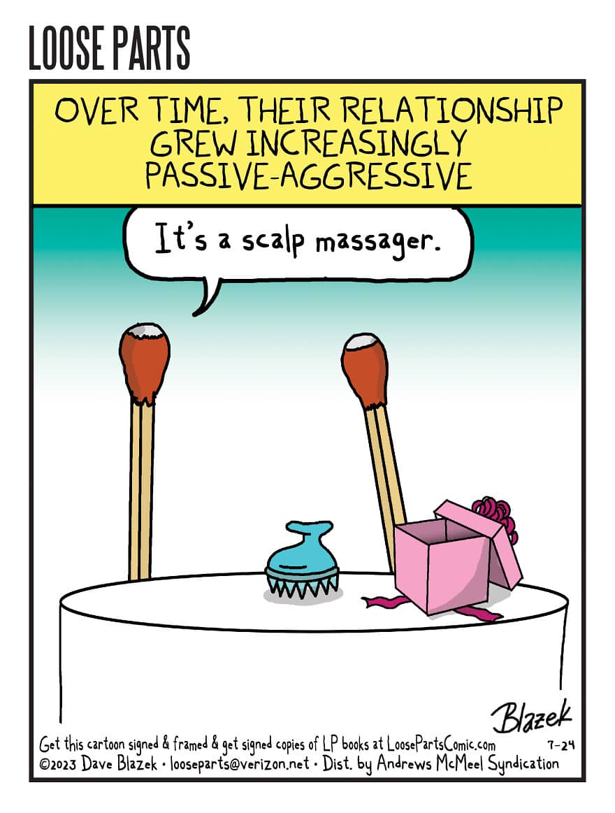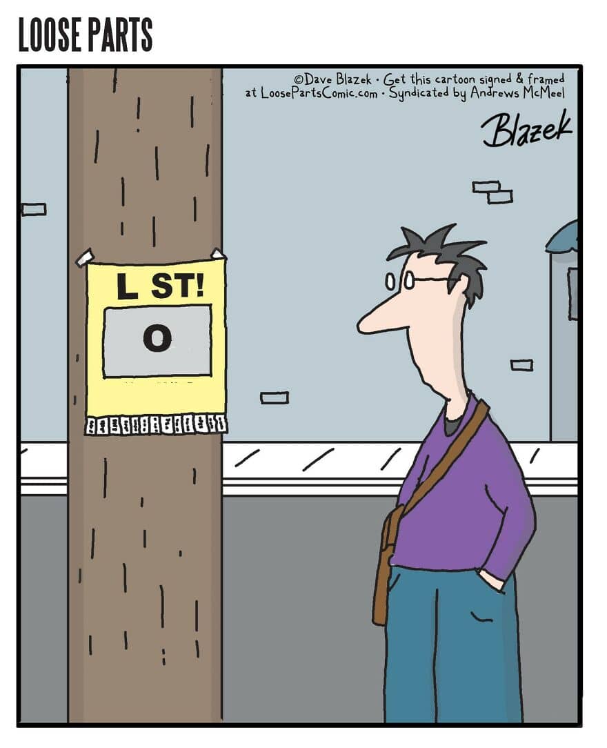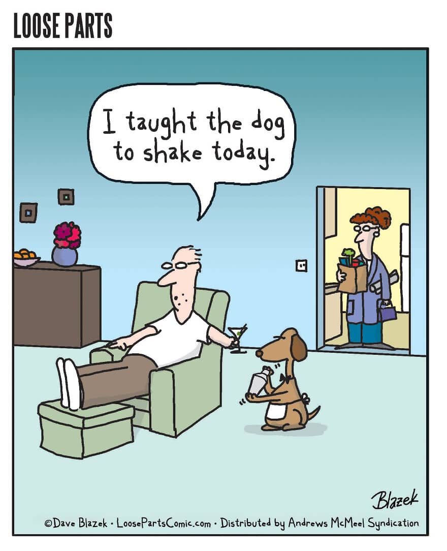 We were wondering what is the most challenging part of creating a comic for the author of Loose Parts. Dave shared with us: “I originally did one Loose Parts cartoon a day while working a full-time job in another career field. I did that for about 15 years, so the big challenge was how to fit everything into an already crowded life. But in 2018, I left that other career to dedicate my time solely to cartooning so I have a lot more air in my day. Now, the challenge is to get better. That means I have to edit myself even harder than ever and self-spike ideas that might be good but aren’t good enough. That means lots more time in a chair staring at the ceiling and writing way more gags than I ever have before.”