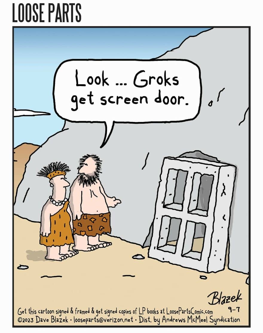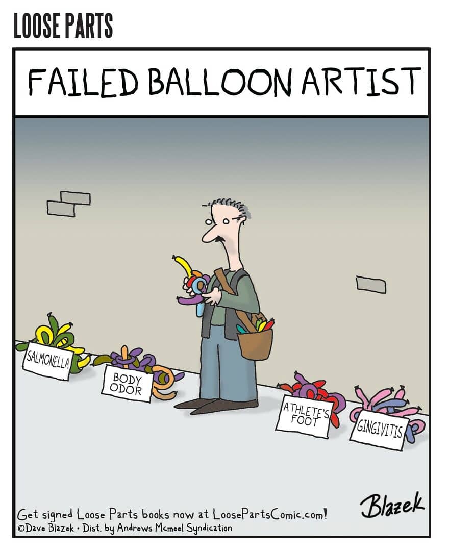 We contacted Dave again to ask him a couple of questions. We wanted to know if Blazek recalled a pivotal moment or experience that significantly impacted his growth as a comic artist. We found out: “I’m not sure how many people know this, but I only learned to draw at age 43 and while Loose Parts was already running in newspapers. During the first few months, I had an artist partner and I only wrote Loose Parts. But he had to drop out for personal reasons and I very quickly had to learn how to draw. I think that put me on the path to a simpler style, and one that best fit the style of my gags. Now, some 10,000 cartoons later, I think I know how to draw.”