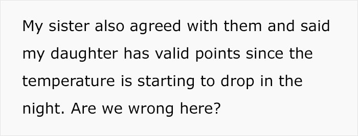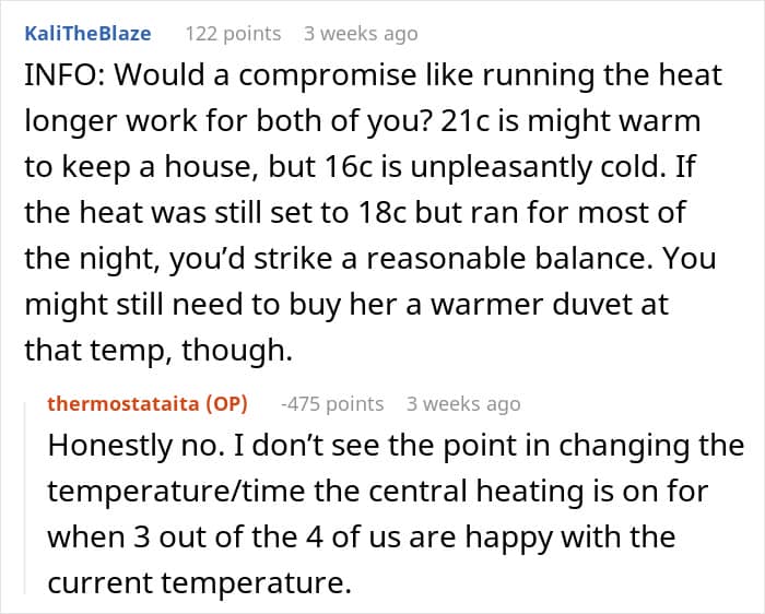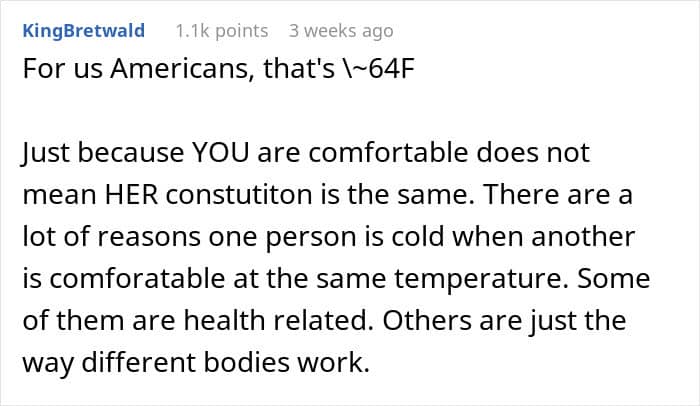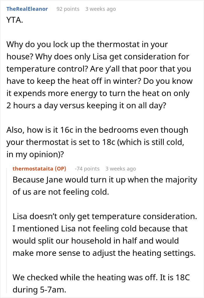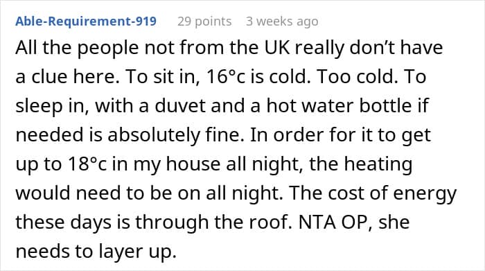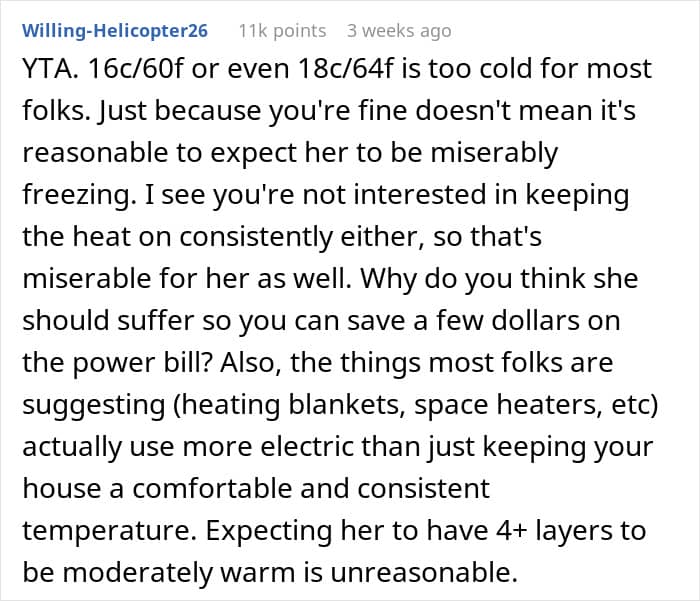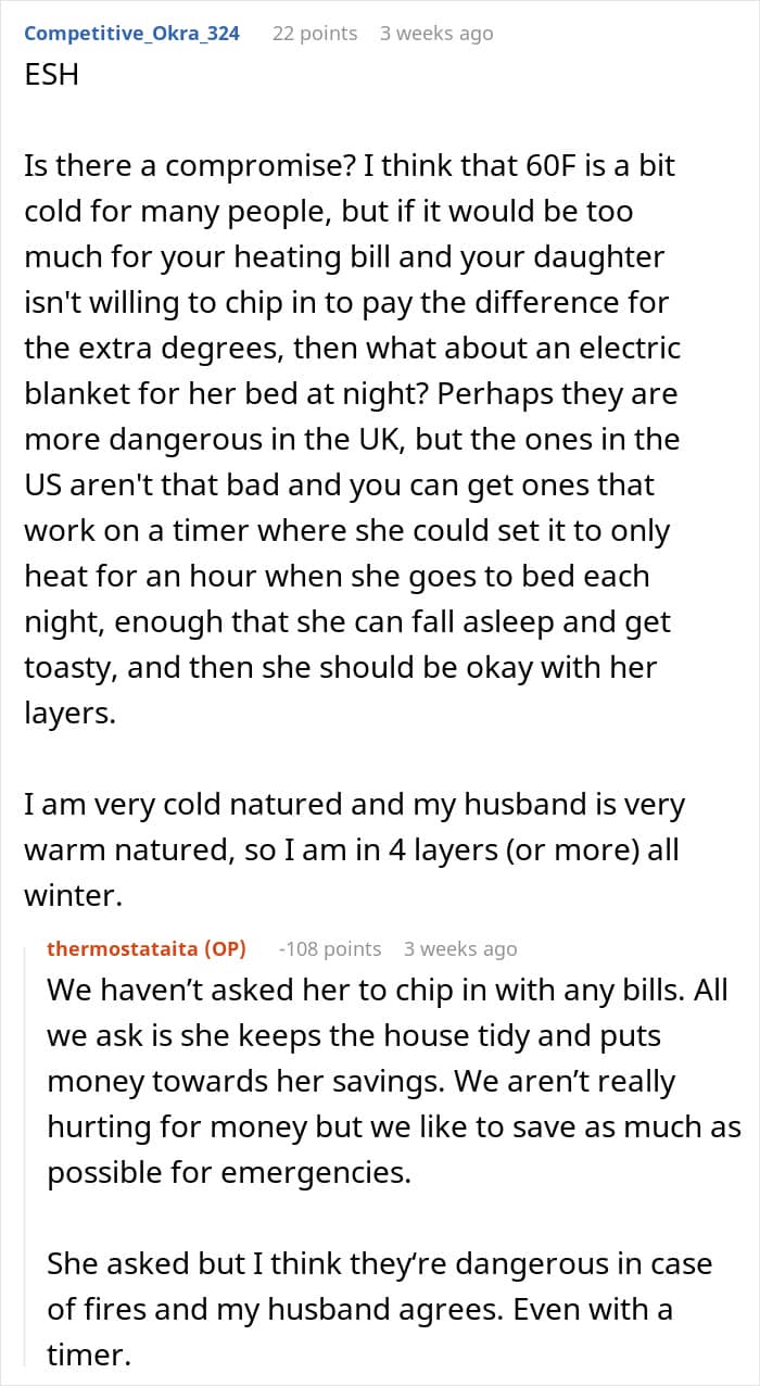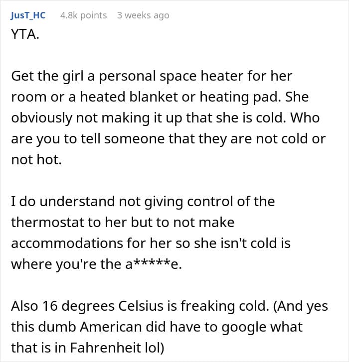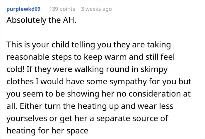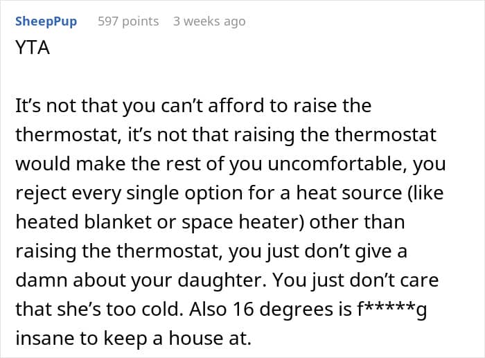 The OP didn’t detail whether her daughter was cold intolerant, or the temperature at home was simply too low for her to feel comfortable. Be that as it may, the woman’s position on not letting the daughter control the thermostat seemingly split the internet community into camps; while some seemed somewhat appalled by her views, others could see where she was coming from.