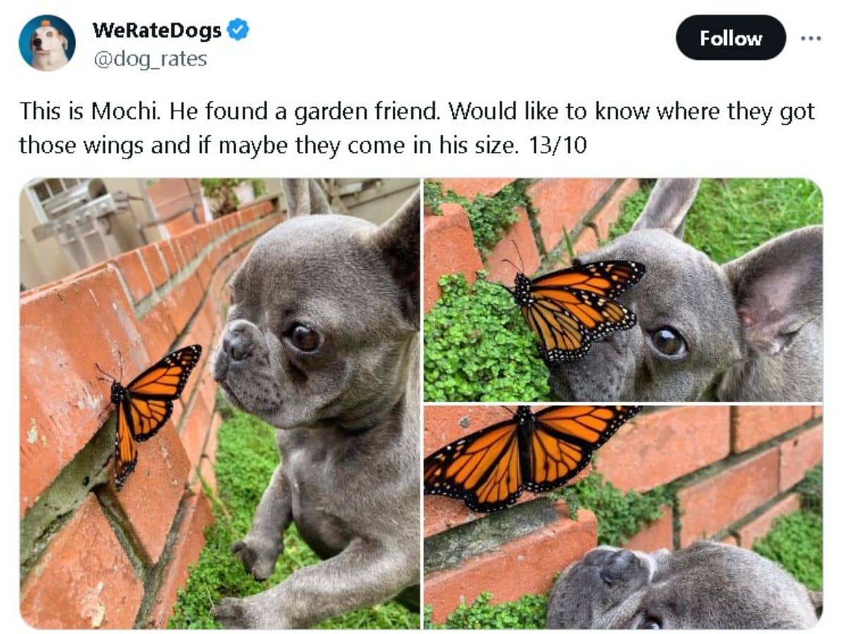 The popular Twitter page, WeRateDogs, took care of everything with their post of Mochi and her butterfly friend.
