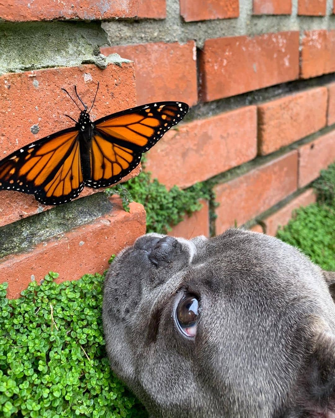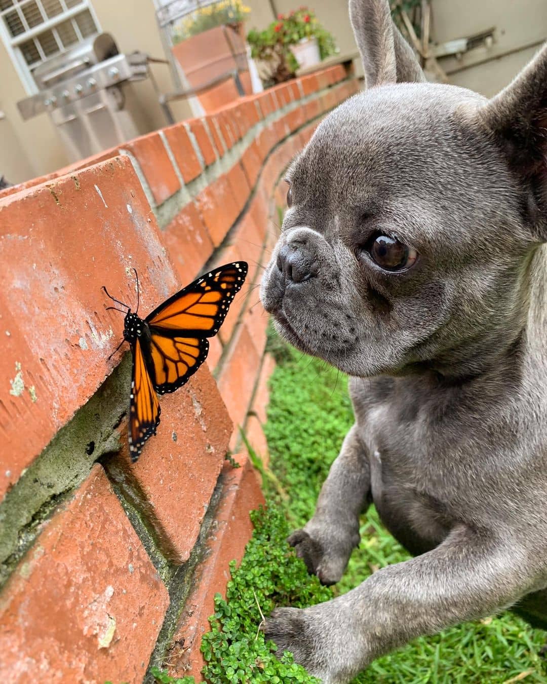 A colorful little stranger occupied the attention of the little Bullie. It was a monarch butterfly, who proceeded to land on their back yard wall to warm his wings in the sun.