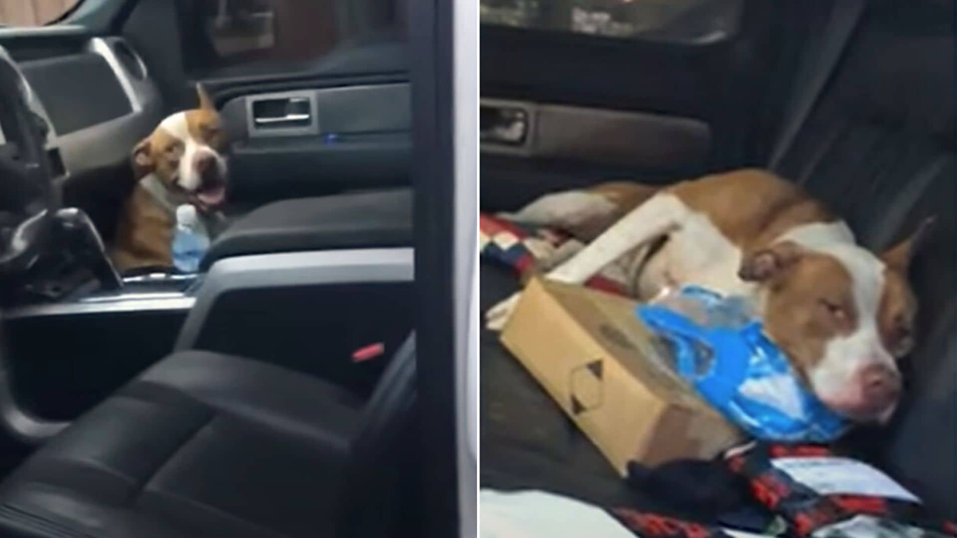 Buddy, the stray Pittie, had the same idea in mind! As soon as he saw an empty truck on someone’s property, he wasted no time entering!